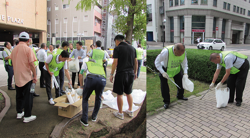 当日は時折小雨が降る不安定な天候となったが、参加者は組合から支給されたビブスや腕章を着用し、約30分にわたって周辺道路や歩道のごみを回収。タバコの吸い殻や空き缶、ペットボトル、落ち葉など、多くのごみが集められた。