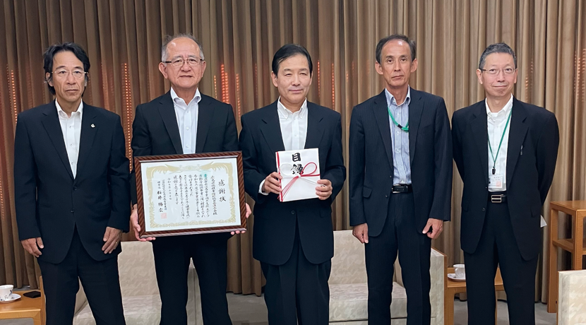 式典では、延川会長が教育事業団の桜井理事長に対し寄付目録(200万円)を手渡し、桜井理事長から感謝状が贈られた。