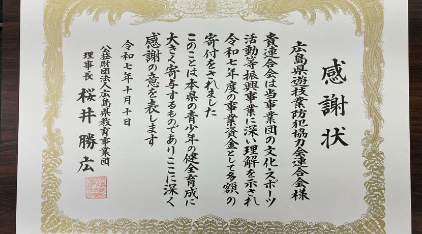 広島県遊技業防犯協力会連合会(延川章喜会長)は10月16日、令和7年度の「文化・スポーツ活動振興事業」(主催:広島県教育事業団)に対して200万円を寄贈し、青少年の健全育成を支援した旨、報告した。