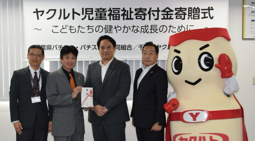 千葉県パチンコ・パチスロ店協同組合(星山聖達理事長)は、県内の児童福祉施設で暮らす子どもたちを支援するため、千葉県児童福祉施設協議会(千児協)へ100万円の寄付金を贈呈した。寄贈式は10月29日、千葉県ヤクルト販売本社で行われ、千葉県健康福祉部や千児協関係者らが出席した。