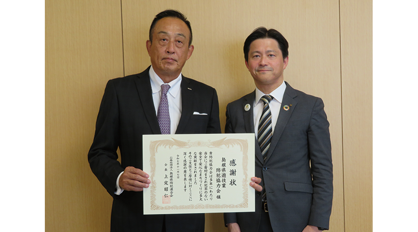 島根県遊技業防犯協力会(村田勝彦会長)は11月7日、長年にわたる寄付や各種支援活動を通じて、犯罪のない安全で安心なまちづくりに貢献したとして、公益社団法人島根県防犯連合会(上定昭仁会長)から感謝状を授与された。