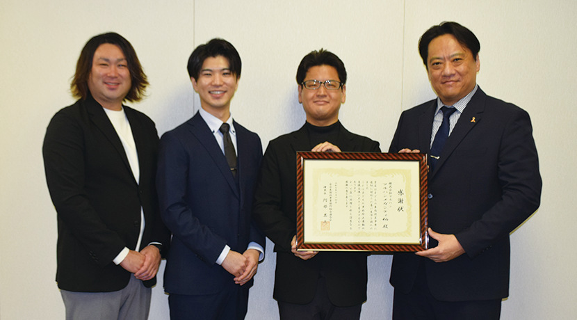 感謝状の贈呈式は千葉県パチンコ・パチスロ店協同組合(星山聖達理事長)の組合事務所で行われ、同組合の星山理事長から関係者に感謝状が手渡された。