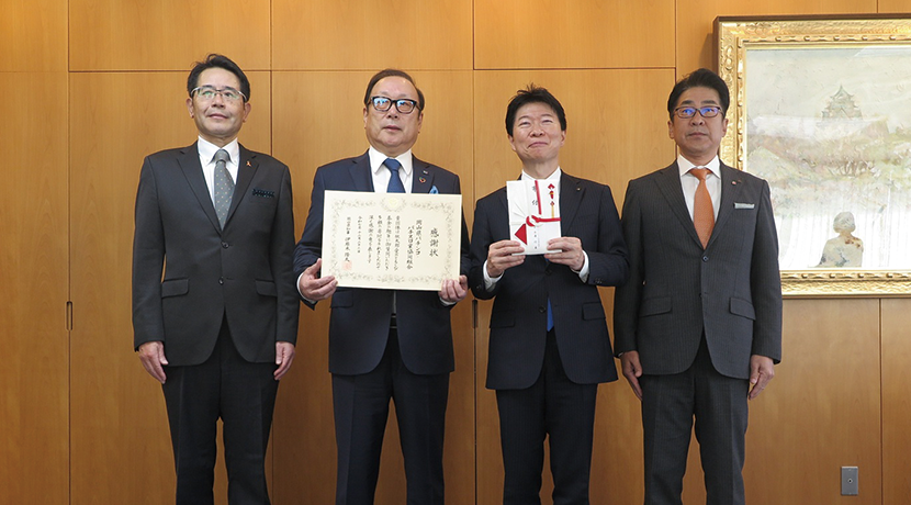 当日は千原理事長、三井浩一副理事長、三澤幸芳専務理事が岡山市北区の岡山県庁を訪問し、「将来の宝である子ども達が健やかに育つように、組合員の思いを届けにきました」とあいさつ。伊原木知事に寄付金を贈呈した。伊原木知事は今回の寄贈に対して「(基金)設立当時継続して寄付をいただきありがとうございます。子どもの貧困対策や障がい者の自立支援に大切に使わせていただきます」と謝辞が述べられた。