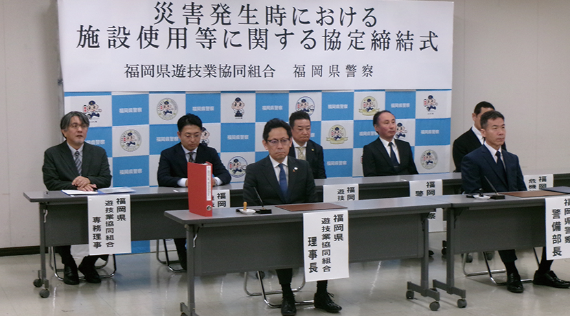 福岡県遊技業協同組合(平岡聖毅理事長)は4月3日、福岡県警察と「災害時における施設利用に関する協定」を締結した。災害発生時における警察活動の迅速化と実効性の向上を図ることが目的。