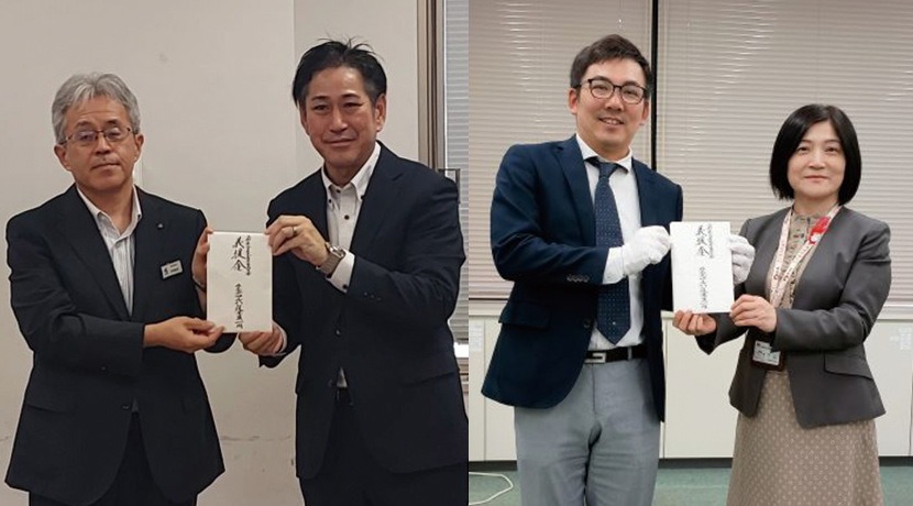 (ヘッダー写真)左:鹿児島県 伊地知保健福祉部長(左)・マルハン代表社員(右)  右:マルハン代表社員(左)・熊本県下山保健福祉部長(右)