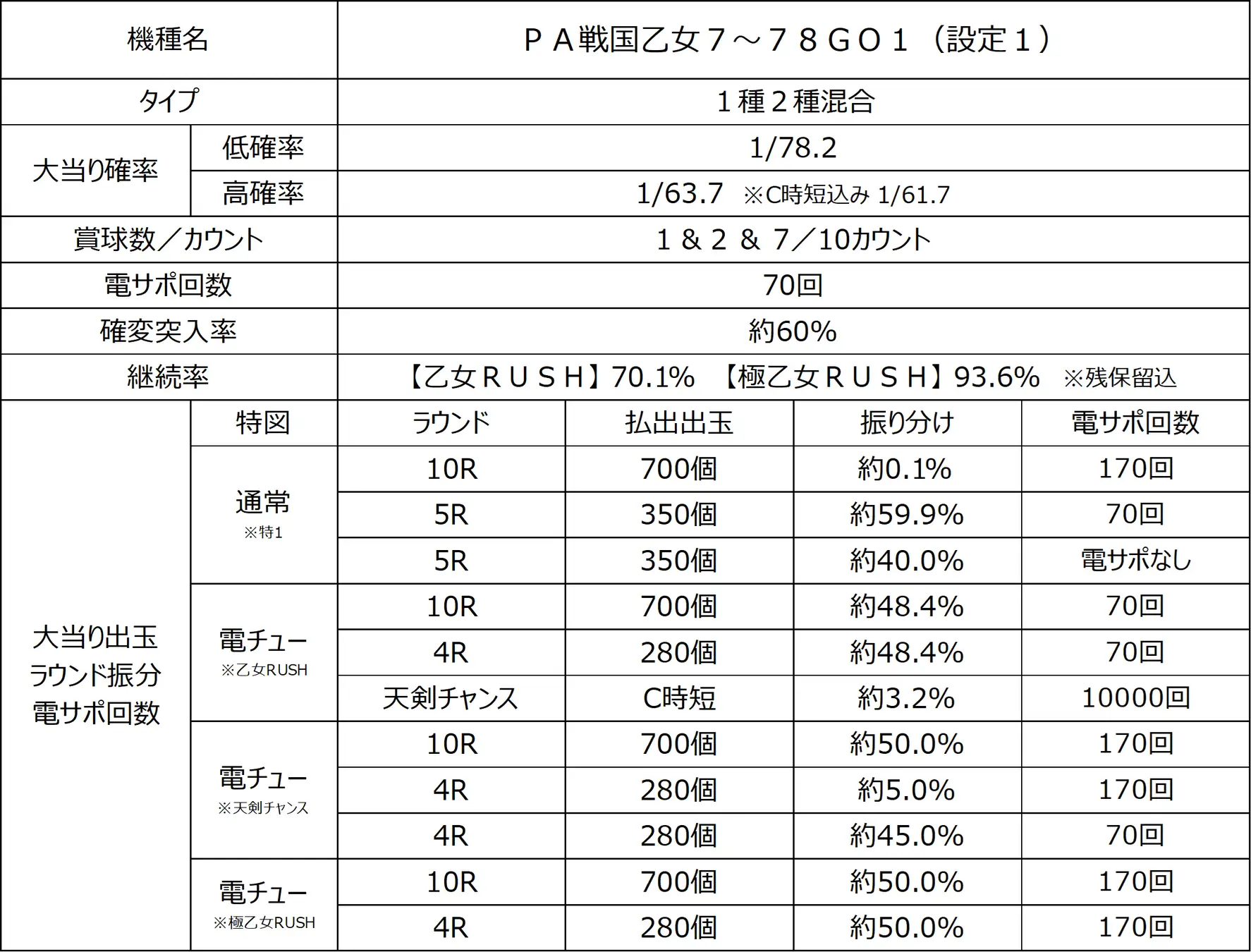 機種の特徴は以下の通り。「遊びやすい大当たり確率(1/78.2~71.9)※6段階設定搭載」「初当たりは最低でも5Rの出玉を獲得可能」「ST中の大当たりは、50%が10R大当たり(700個)」「天剣チャンス中の大当たりの55%でラッキートリガー発動」。機種の詳細はダイナムPB「ごらく」サイト(https://www.dynam.jp/pb/)にアップされている。