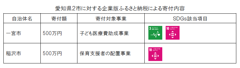 同社の名古屋事業所は愛知県一宮市と稲沢市にまたがって所在しており、両市ともにゆかりがある。今回の寄付は、各市の持続的・安定的な成長の実現と少子高齢化の社会的問題への取り組みに有効に活用してもらえることを期待して行われた。なお、寄付対象事業は下表の通り。